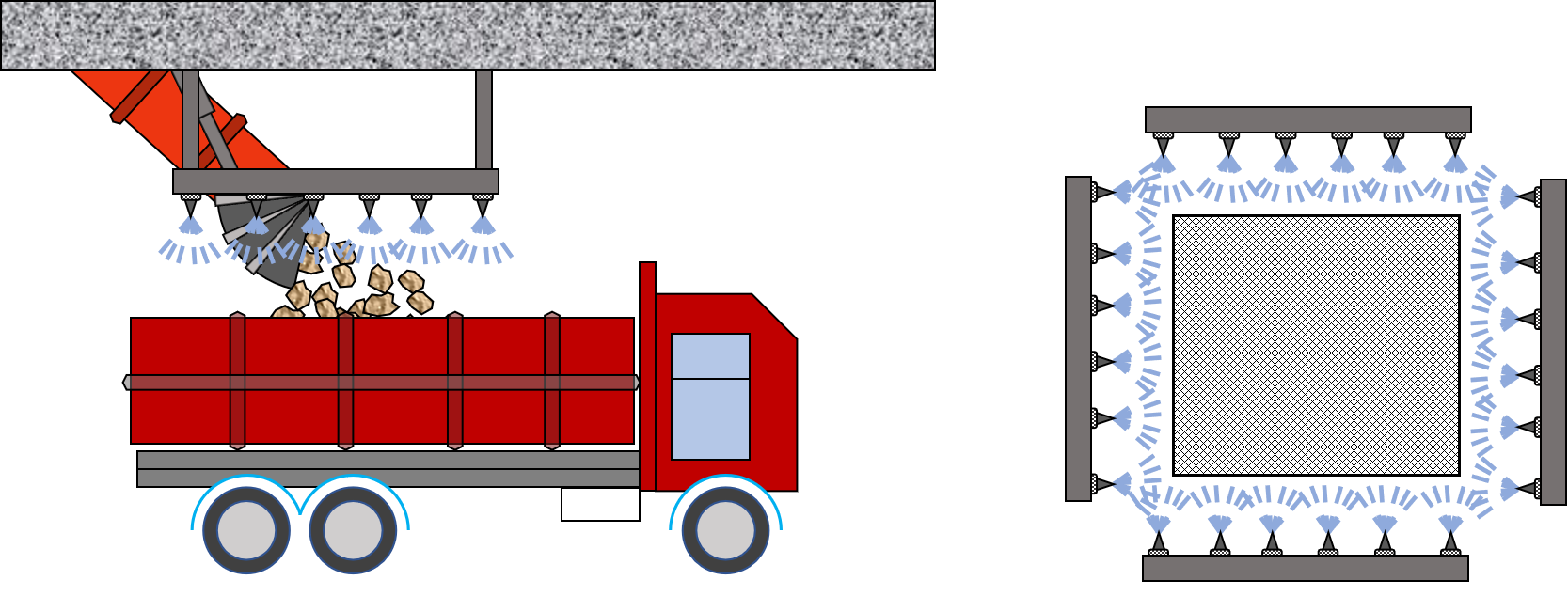 装车口向卡车内进行卸料,由于存在高度差,并且一般落料口只有挡尘帘进行遮挡,不能进行完全的封闭,在卡车接料的时候会产生大量的粉尘,这些粉尘会随着卡车的移动加快扩散,卡车在装车完毕后,启动的瞬间也会带动大量的粉尘,不仅影响装车的进度,还会造成厂区的污染。通过干雾抑尘系统可以有效地对装车口的粉尘进行抑制。