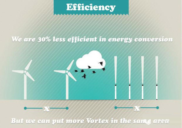 Vortex方面透露,在同样面积的地面上,Vortex 的装机量可以比常规的水平轴风电机多一倍,这就弥补了目前Vortex 的风能利用效率比常规风机低30% 的劣势,而且,一台Vortex 风机的制造成本只有常规风机的一半。