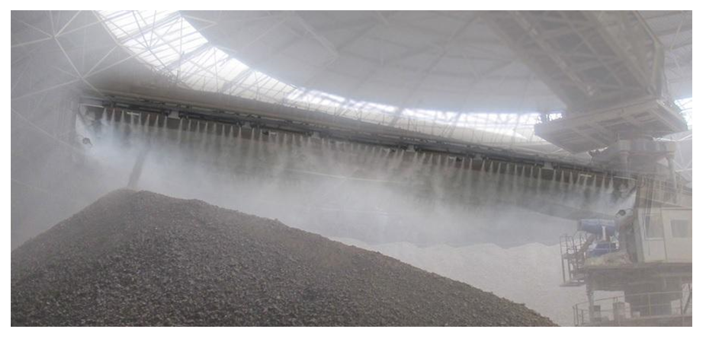 为改善料场内的环境,一些单位采用水雾喷淋的方式,减少料场内的扬尘,但这种方式有着不可避免的劣势。首先,水雾颗粒较大,难以捕获一些较小的粉尘颗粒,降尘效果一般;其次,由于水雾喷淋用水量较大,会在料场地面产生积水,同样不利于料场环境的改善。