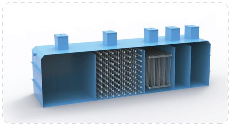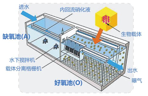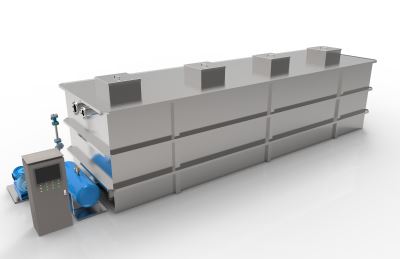 一体化生化处理设备是将A/O生化处理和MBR膜生物反应综合于一体的集成设备,主要包括水解酸化(A)池、接触氧化(O)池、MBR膜生物反应器以及配套的清水池和污泥池。