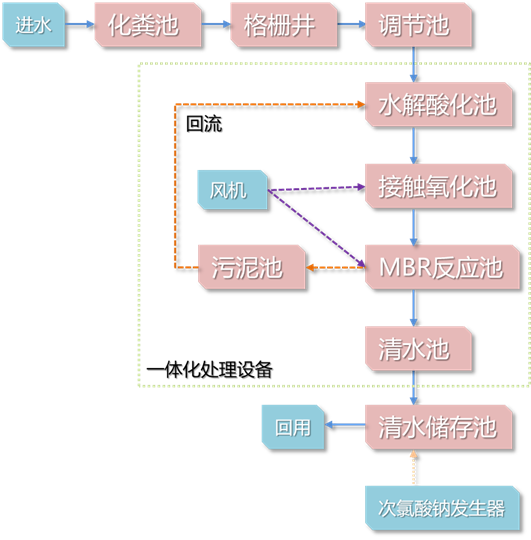 本套处理工艺包括以下流程:格栅→调节池→A/O→MBR→次氯酸钠消毒→精细过滤系统→紫外消毒→达标排放。处理后的水,即可直接排放至IV、V类水体中,也可用于回用,有利于水资源的循环使用。